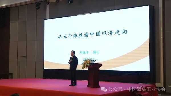 在主题报告环节,经济学家、国家统计局原局长邱晓华以《从五个维度看中国经济走向》为题,深入分析了当前中国经济的总体形势和未来发展趋势。他分别从特朗普2.0政策的冲击力、国内宏观政策的刺激力度、房地产深度调整的前景、新旧动能转化的效果以及全球地缘政治风险的演变五个维度进行了详细的剖析,预测了2025年的消费趋势、投资形势、外贸形势和物价形势。他最后指出,新的一年企业都要学会在不确定中把握确定性,罐头产业作为传统优势产业,应更加乐观积极地应对挑战,实现持续健康发展。