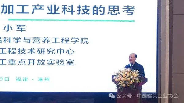 中国农业大学食品科学与营养工程学院院长廖小军做了《面向未来果蔬食品加工产业科技的思考》的报告。他首先分析了果蔬食品加工产业的战略意义和科技现状,然后指出了产业的发展趋势,包括加工原料供给方式发生新变化、加工产业结构出现新布局、消费需求出现新趋势以及行业转型升级新方向。接着重点介绍了科技创新挑战的五个方面,分别是原料挖掘利用技术、加工共性关键技术、重大工艺集成模式、消费新业态下的产品开发与利用以及零售新场景下的产品开发与利用。他最后强调罐头行业守正加创新才能拥有未来。